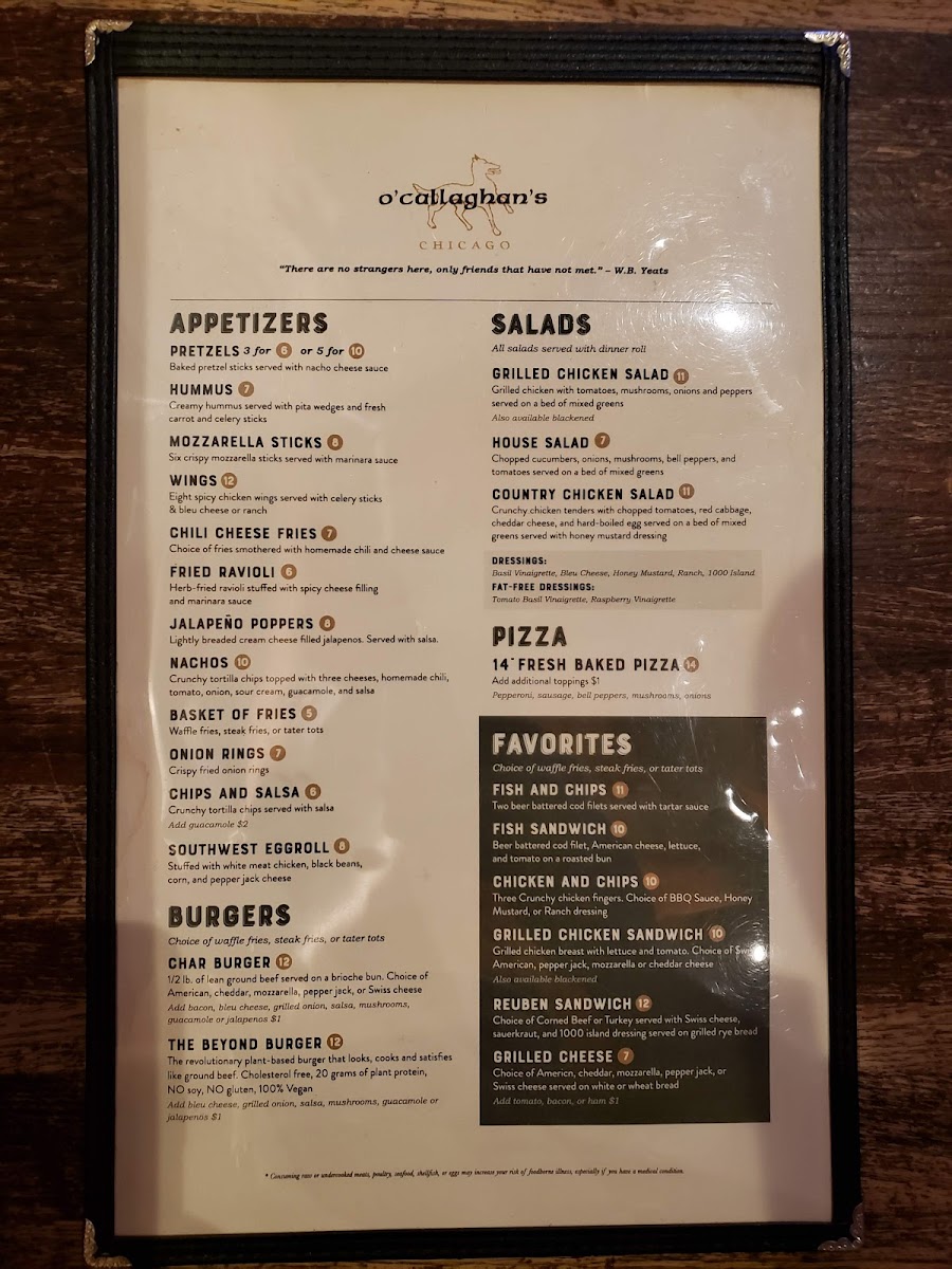 Welcome to O'Callaghan's, where the heart of Ireland meets the vibrant energy of Chicago at 29 W Hubbard St. This cozy establishment prides itself on serving authentic Irish fare with a warm atmosphere that's perfect for a casual outing or a special celebration.